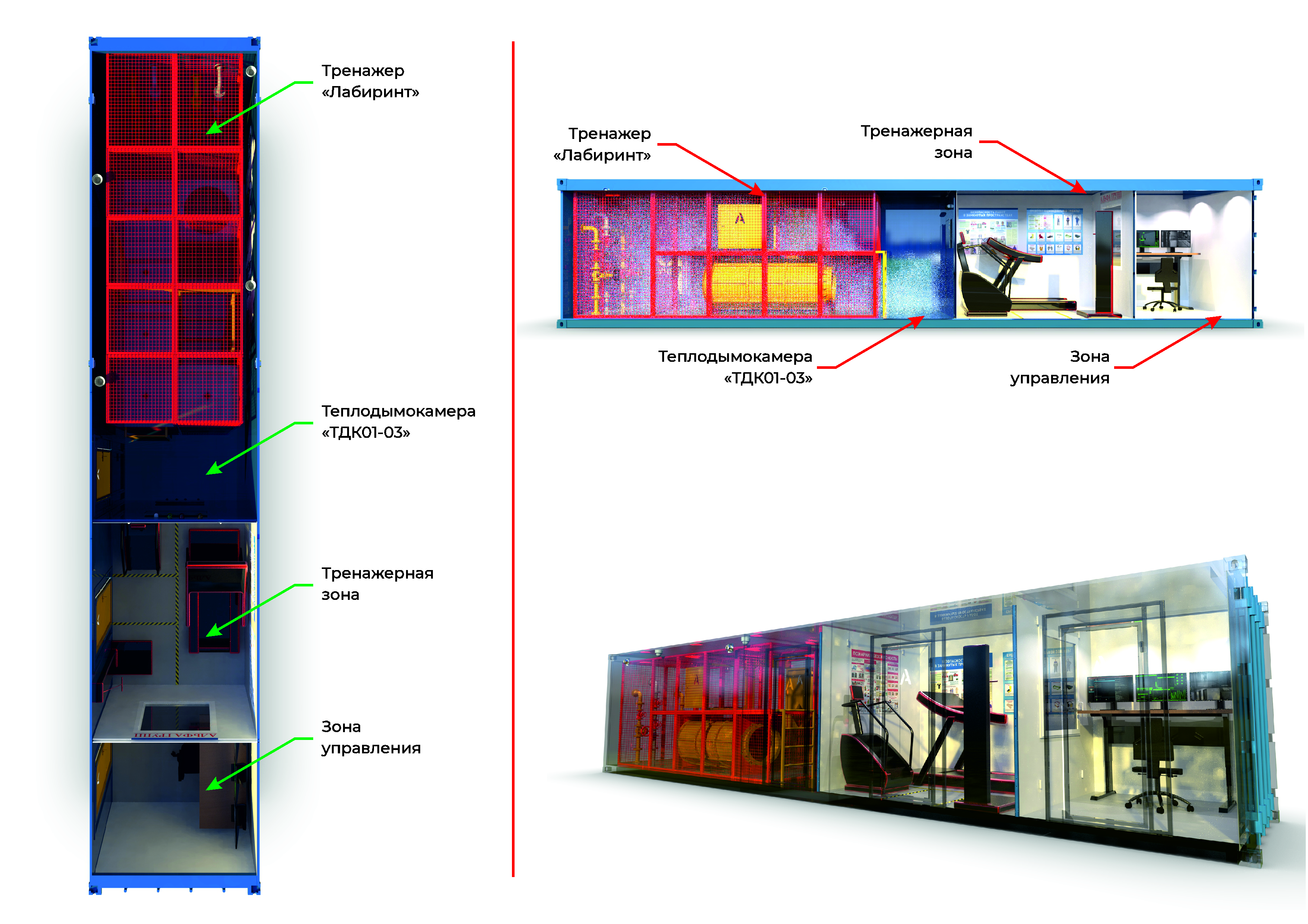 1. Зона управления: Централизованный пункт управления всем комплексом. Оборудована компьютеризированным пультом для точного контроля и программирования параметров тренировки (температура, плотность и скорость подачи дыма, длительность этапов). Обеспечивает визуальный мониторинг происходящего в зонах через систему видеонаблюдения, голосовую связь с обучающимися и мгновенную активацию всех аварийных протоколов.